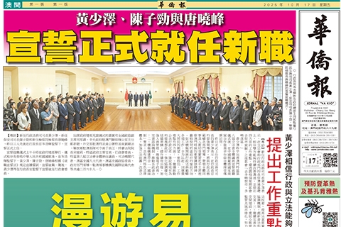 【專訪】新任行政法務司司長黃少澤、新任保安司司長陳子勁和新任檢察院檢察長唐曉峰、昨日三人先後在行政長官岑浩輝監誓下,宣誓正式上任。 宣誓就職儀式上午十時在政府總部舉行。儀式程序先奏唱中華人民共和國國歌後,在岑浩輝監誓下,黃少澤、陳子勁、唐曉峰根據《就職宣誓法》規定宣讀誓詞,宣誓就職。隨後,黃少澤再…