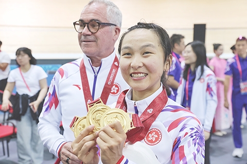 ◎ 十一月十七日,第十五屆全國運動會場地自行車項目女子全能賽在香港單車館舉行,港隊代表李思穎以一百廿四分奪冠,取得個人今屆全運會第三面金牌。圖為李思穎展示獲得的三枚金牌。(香港中通社記者 謝光磊 攝)