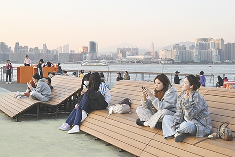 ◎ 一月九日,臨近傍晚,有民眾在香港炮台山海濱的東岸公園主題區遊玩,觀賞維多利亞港日落景色,享受悠閑時光。(中新社記者李志華 攝)