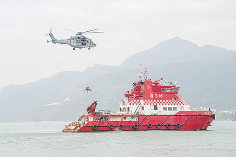 ◎ 一月十二日,香港民航處在大嶼山望東灣附近海域舉行應急搜索及救援演練,聯同飛行服務隊、警務處、消防處等多個政府部門,以及解放軍駐港部隊參與,測試跨部門協作及海空搜救能力。圖為飛行服務隊直升機從消防船轉送生還者前往醫院。(香港中通社記者 陳奕啟 攝)
