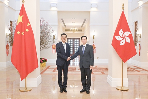 ◎ 二月廿五日,香港特區行政長官李家超(右)在禮賓府與廣西壯族自治區黨委書記陳剛(左)會面。(香港中通社圖片)
