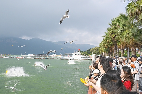 ◎ 十月十四日,遊客在海埂東碼頭觀鷗。近日,越冬紅嘴鷗「先頭部隊」已經抵達雲南省昆明市滇池水域,吸引市民和遊客。(中新社記者 李嘉嫻 攝)
