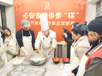 穿上厨師服、戴上厨師帽、準備好食材……1月23日早晨,上海十大名廚之一、中式麵點高級技師鄧修青早早來到上海萬佛寺,迎接一群「新徒弟」,傳授製作桂花糕的「秘訣」。