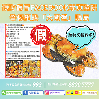 司法警察局近日接獲多宗涉及「網上訂購大閘蟹」的詐騙舉報。騙徒於Facebook假冒本澳商戶開設虛假專頁,並以優惠價錢預訂「大閘蟹」作招徠,吸引市民以「先付款、後取貨」方式進行交易。然而當事主按對方提供的「未認證」MPay二維碼進行掃碼支付後,一直未有收到相關貨品,並發現對方已失去聯絡,始察覺上當受騙。經統計,十月至今,已有五名市民被騙前來司法警察局報案,各人報稱損失金額由數百至二千澳門元不等。