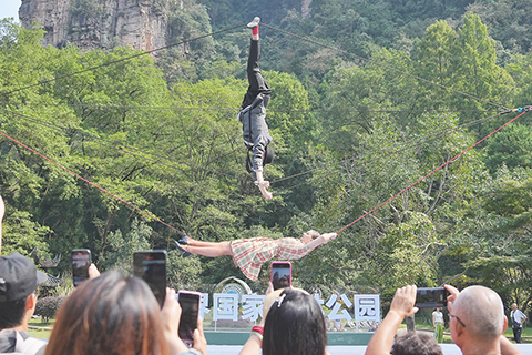 國際雜技演員張家界峰林中獻藝 2025-10-13 03:31:00 ◎ 十月十二日,在湖南張家界舉行的二0二五張家界國際新雜技戲劇周上,來自俄羅斯、德國、智利等國家和地區的演員在峰林中表演雜技,雜技動作與奇峰景觀相融合,吸引遊客圍觀。圖為俄羅斯演員進行軟鋼絲雜技表演。(中新社)