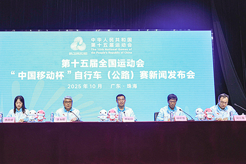【特訊】第十五屆全國運動會自行車(公路)賽13日下午三時在珠海舉行新聞發佈會,珠海賽區執委會副主任、珠海市副市長黃振球,香港賽區統籌辦公室主任楊德強,澳門賽區籌備辦公室主任潘永權,珠海賽區執委會辦公室常務副主任、珠海市文化廣電旅遊體育局局長閔雲童等三地賽區代表出席。