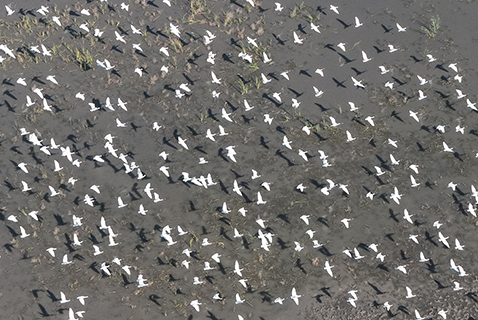 在淺水灘塗,大量白鶴覓食、洗羽,與小鶴共度「親子時光」;東方白鸛在稻田間踱步;野鴨和大雁成群飛翔,場面壯觀。濕地多樣的植被和充足食物,使這裡成為候鳥理想的「補給站」。