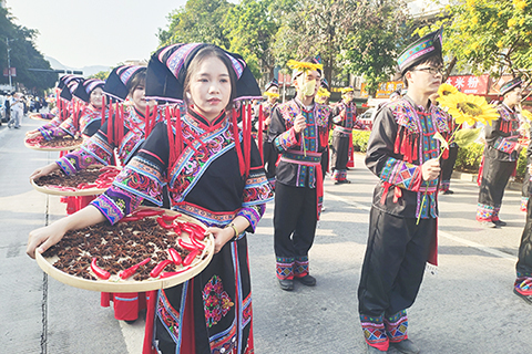當天,大新縣二十餘個主題方陣隊伍沿街巡遊,展示當地特色風情。在開幕式演出現場,《儂峒》《高平迎君歸》《唄唄儂儂》等節目逐一上演。一曲大合唱《你來我往有情緣》,唱出中越兩國民眾傳承友誼的共同心聲。