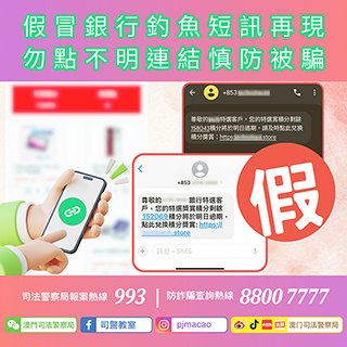 近日,司法警察局發現騙徒再次冒充本澳多家銀行的名義,隨機向市民發送釣魚短訊,以「獎賞積分即將到期」為由,誘使市民點擊短訊內附帶的釣魚連結。由於騙徒的釣魚短訊有可能會混入市民與銀行的真實短訊對話框內,市民務必提高警覺。