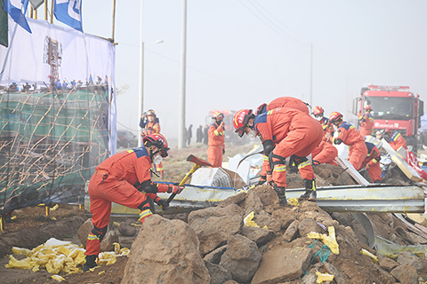 ◎ 十月十七日,在國家衛生健康委員會醫療應急司指導下,甘肅、西藏、陝西、青海、寧夏、新疆六省(區)衛生健康委員會等單位聯合主辦的西部六省(區)衛生應急綜合演練在甘肅蘭州新區舉行。本次演練以模擬蘭州新區某地發生七級地震為背景,設置了集貿市場、在建工地、車輛事故和山體滑坡等四個現實場景,從生命搜救、醫療救治等十餘個實戰科目,全面檢驗了六省(區)在突發重大自然災害中的應急響應、協同聯動和綜合處置能力。圖為綜合演練現場,消防救援人員進行搜救工作。(中新社記者 李亞龍 攝)