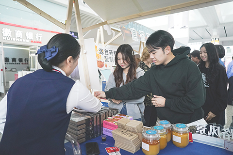 ◎ 十月十七日,旅客在合肥南站非遺美食文化展台前了解特色商品。當日,「我的鐵路風景.尋味長三角」系列活動暨「徽風皖味在南站」非遺美食文化節在合肥南站啟動。本次活動在合肥南站打造集文化展示、美食體驗、物流展示、品牌傳播於一體的消費新場景,活動將持續至十月廿四日。(新華社記者 杜宇 攝)