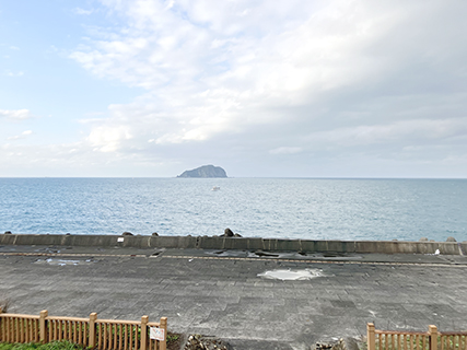 透過長方形的大石框,眺望前方,萬里波濤浩瀚,微瀾皺摺起伏,碧空白雲風捲,棉絮浮湧飄飄,海涯正中的基隆嶼,如輕舟一葉,灰沉沉,孤伶伶,臺灣東北的基隆海岸,彎曲蜿蜒,海闊天青,視野無涯,心曠神怡。