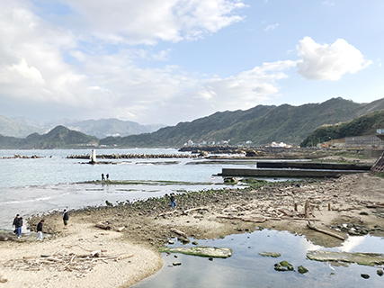 隨意在走道上蹓躂,在草地上坐卧,蒼翠的基隆山在側畔橫亙,參差的海蝕平台在眼下盤桓,涼風迎面拂煦,濤聲耳邊沉吟,山圍水繞,自然環抱,配合灘旁新建的福長宮,青石金欄,紅頂棕簷,與飛龍玉鳯裝飾,交融輝映,更添悠閒欣賞的雅興。