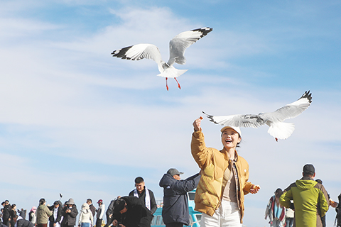 水鳥翩躚引客來 2025-10-23 03:30:00 ◎ 十月二十二日,青海省共和縣青海湖畔,遊客與水鳥互動。金秋十月,青海湖畔草地泛起金黃,羊群在草地上悠然自在,碧藍的湖面上,水鳥翩躚,與遊客親密互動,構成一幅人與自然和諧共生的柔美畫卷。(中新社記者 馬銘言 攝)