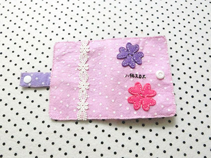 (六)用珠針將重疊的卡片面布、卡片貼布固定好,並在適合位置套入布帶布,再以鎖針的方法縫製,注意另一邊布面暫不用縫製。