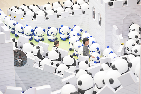 ◎ 十月二十七日,正值第九個「國際熊貓日」,小朋友在北京國貿商城的一處熊貓藝術裝置玩耍。據悉,該藝術裝置由近四百只「熊貓」和「長城」組成,詮釋和合共生的理念。(中新社記者張祥毅 攝)