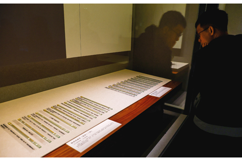 ◎ 十月廿八日,「簡『讀』中國──中國出土簡牘展」在湖北武漢開展。此次展覽共展出近二百三十件(組)簡牘,以物證史、簡「讀」中國。圖為觀眾參觀展出的睡虎地秦簡《秦律雜抄》(右)。(中新社記者 張暢 攝)