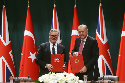 英國決定向土耳其出售20架「台風」戰機 2025-10-29 03:30:00 ◎ 土耳其和英國十月二十七日簽署一項價值八十億英鎊(約合一百零七億美元)的軍售協議,英國將在十年內向土耳其出售二十架「台風」戰機。圖為當日,土耳其總統埃爾多安(右)在首都安卡拉與到訪的英國首相斯塔默共同展示兩國簽署的軍售協議。(新華社發 穆斯塔法.卡亞 攝)
