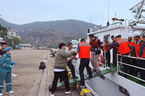 十四時二十二分,救援船載著患病船員順利靠泊海事碼頭。在此等候的海事執法人員立即上前,平穩將船員轉移上岸,由一百二十救護人員迅速接過救助「接力棒」,將船員緊急送往醫院。