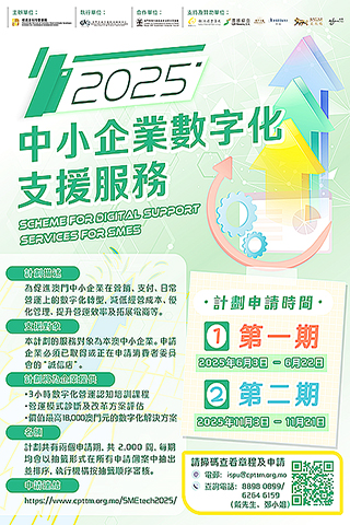 【特訊】為提升企業競爭力及營運效率,助力本澳中小企業加快數字化轉型,經濟及科技發展局推出「二零二五中小企業數字化支援服務」(下稱「計劃」),並委託澳門生產力暨科技轉移中心執行。該計劃第二期將於今(三)日起至二零二五年十一月廿一日接受申請,提供七百五十個支援名額。歡迎有興趣的企業踴躍報名。