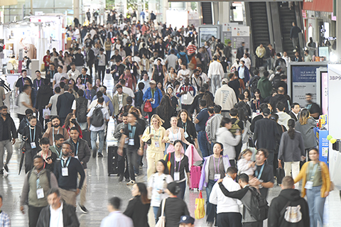 ◎ 十一月四日,在廣州舉辦的第一百卅八屆中國進出口商品交易會(廣交會)閉幕。據廣交會組委會統計,本屆廣交會共有來自二廿三個國家和地區的超卅一萬名境外採購商到會,現場意向出口成交二百五十六億五千萬美元。圖為廣交會展館內客流如織。(中新社記者陳驥旻 攝)