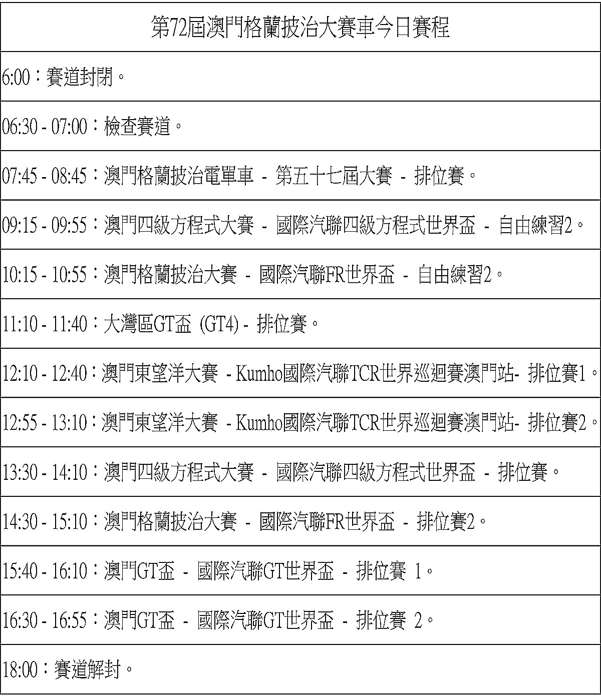 格蘭披治大賽車格電排位賽將於上午七時四十五分展開。昨日自由練習,8號英國車手陶德在練習尾段造出最快圈,四屆冠軍、88號的另一名英國車手赫爾文第二。