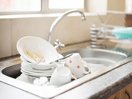 把髒碗盤全部疊在一起,除了有交叉感染的風險,也會使之後的清洗變得更加困難。因此,盛裝生鮮肉品的餐具應分開放置,而油膩餐具與裝蔬果的碗盤也應分開清洗。較油膩的碗盤可先用紙巾將油垢擦除,洗碗時不僅更輕鬆,也可以防止油污造成水管堵塞。