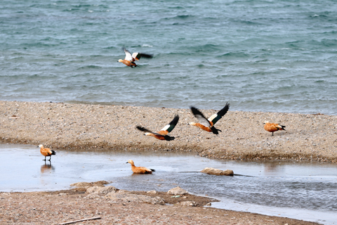 ◎ 十一月十六日,青海省海南藏族自治州共和縣青海湖二郎劍景區,陸續遷徙而至的候鳥在青海湖濕地內飛翔、覓食。近期,隨著遷徙季的到來,各種候鳥已經陸續結隊抵達青海湖國家級自然保護區。據青海湖國家級自然保護區管理局保護科提供數據,青海湖保護區觀察記錄的鳥類已達282種,其中水鳥102種。圖為飛翔的赤麻鴨。(中新社發 張忠蘋 攝)