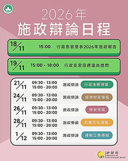 各領域施政方針的立法會辯論會議,日程分別是:11月21日辯論行政法務領域、24日辯論經濟財政領域、26日辯論保安領域、28日辯論社會文化領域,以及12月1日辯論運輸工務領域的施政方針。◇