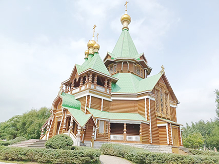 艷陽天的下午穿過花徑,來到聖・尼古拉大教堂(俄羅斯東正教),整座教堂採用木構架井幹式建成,據導遊介紹該教堂是屬於俄羅斯哥德式的八面體木結構。整座建築物是由整齊的原木水準疊砌成的牆體,牆體交叉處與原木互相咬合。這種井幹式圓木結構建築,特出了八面尖角的屋頂和周圍的北方自然景色十分和諧,中央大圓頂上矗立鋼製的鍍金大十字架,帳篷頂端的5個洋蔥形穹頂和多變的造型。教堂正門的聖母像和壁畫,是俄國畫家古爾希齊文克所作,顯現出莊嚴肅穆又具富麗堂皇的氣派。