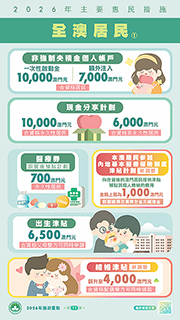 行政長官岑浩輝昨日發表二零二六年度施政報告,當中多項惠民措施將繼續落實,包括繼續發放現金分享,向合資格永久性居民發放澳門幣一萬元,並向合資格非永久性居民發放澳門幣六千元;全澳居民可享有的醫療券澳門幣七百元維持不變,並向每名合資格居民的非強制央積金個人帳戶額外注資七千元。特區政府二零二六年繼續向合資格長者發放一萬元敬老金,以及每月三千九百元的養老金。另外,本澳居民參加內地醫保制度津貼計劃,範圍擴展至廣東全省及福建省,補貼上限為澳門幣一千元。