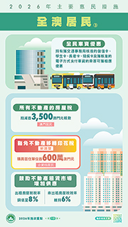 部份津貼及補貼則維持不變,包括出生津貼維持澳門幣六千五百元,合資格父母雙方可同時申請,育兒津貼亦會繼續發放,電費及水費補貼維持不變。繼續實施全民車資計劃,合資格居民購買居住單位首六百萬元豁免不動產移轉印花稅。將繼續二零二六至二零二九年新一期持續進修發展計劃,每名合資格巿民上限為澳門幣六千元。僱員方面,明年繼續減收職業稅百分之三十,一般僱員免稅額為十四萬四千元,殘疾僱員以及六十五長者僱員免稅額為十九萬八千元,並向已繳職業稅居民退還百分之六十的稅額,上限為澳門幣一萬四千元。教育方面,免費教育學費津貼、回歸教育津貼、教學人員的專業發展津貼及直接津貼、非高等教育書簿津貼、大學生學習用品津貼等將繼續發放。◇