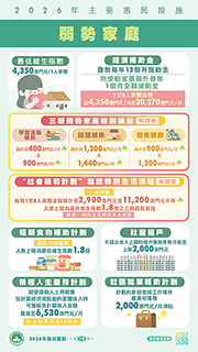 特區政府明年加大部份福利津貼投入,包括結婚津貼調升至澳門幣四千元,合資格配偶雙方可同時領取;失業津貼調升至每日澳門幣二百一十元;喪葬津貼調升至五千二百元,疾病津貼亦有所提升,非住院調升至每日澳門幣一百八十元,住院則調升至每日澳門幣二百四十元。照顧者津貼調升至每月澳門幣二千四百元,同時降低申請門檻及擴大適用對象範圍。政府並提升三類弱勢家庭特別補助,包括學習活動補助調升至澳門幣四百至九百元,護理補助調升至澳門幣一千二百元至一千四百四十元,殘疾補助調升至澳門幣九百至一千二百元;「社會融和計劃」發放特別生活津貼每期一至八人家團金額調升至澳門幣二千九百元至一萬一千二百元不等。