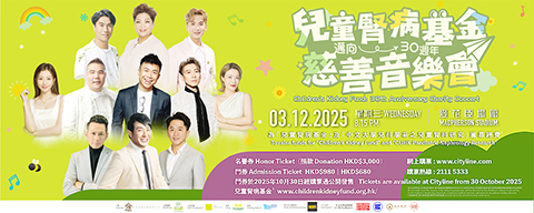 為慶祝「兒童腎病基金」邁向30周年,同時為兒童腎病研究及病童家庭籌募更多支援經費,《兒童腎病基金  邁向30周年慈善音樂會》將於12月3日 (星期三) 晚上在麥花臣場館舉行,參與歌手及藝人包括肥媽 Maria Cordero、梁思浩、吳家樂、鄧兆尊、陳奐仁、周吉佩、龍婷、支嚳儀、顏米羔、劉洋和李金凱,屆時大家一起以音樂傳遞愛與希望。票價分別為$3000 (名譽券)、$980 和$680 三種,現於Cityline公開發售。