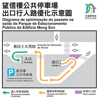 新安排下,車輛將改由近政府綜合服務中心(望信樓第二座)的原有出口位置進場,並透過近望信樓第一座的原有入口位置離開。新設計讓駛離車輛可經內街轉入慕拉士大馬路,使出口位置與路口保持約五十米的緩衝距離,並可讓駕駛者選擇轉線駛往東北大馬路,從而提升行車效率。隨著第一階段工程完成,交通事務局接續將優化出口處的行人路,並設置分隔設施,避免車輛出車後與行人動線交疊,保障行人安全,工程預計於下月八日完成。