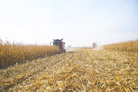 ◎ 十一月二十一日,甘肅蘭州新區項目建設中心籽粒玉米種植基地,大型聯合收割機收割籽粒玉米。近期,籽粒玉米在蘭州新區高海拔區域首次試種成功迎來豐收,驗證了品種適配性與種植模式的可行性,豐富了區域農業產業結構,保障了糧食安全。作為區域糧食安全的「守護者」,蘭州新區項目建設中心聚焦籽粒玉米「種、收、烘」環節,配套水肥一體化滴灌、無人機防治,較傳統種植增產百分之十五。(中新社記者 李亞龍 攝)