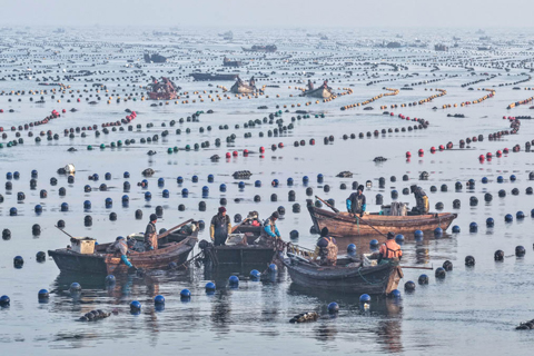 ◎ 十一月廿四日,山東榮成俚島鎮海帶養殖區,工人們抓緊進行夾苗、放苗等作業,海上「冬播」繁忙。作為中國重要的海帶產地,榮成海帶養殖面積超十六萬畝。(無人機照片)(中新社發 李信君 攝)