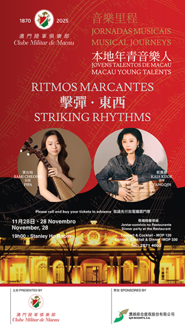 戴建業稱主軸是「全力拼經濟,聚力拓多元」 明年重點推進四方面工作 全運會為澳旅遊帶來很多新發展方向 冀吸引更多體育專案來澳 下月二十日至廿二日推餐飲堂食優惠 已有六百間社區商戶參與 就業調查的方法及統計概念 均依國際勞工組織指引訂定 《澳門特別行政區公報》內容簡介 勞工局正加大力度收集四大產業相關企業空缺 明年推「1+4」產業職訓課程 憑作品《九聲》參加阿聯酋世界劇場設計展 梁順裕摘燈光設計銀獎 對博企非博彩投資 澳府將推動全面檢討 數據科學廳新增AI展品並辦AI講座 科學館AI教育服務萬八人次 將以會議論壇及廚藝交流等帶出蓉順澳揚淮潮六地美食文化 「美食之都聚濠江」下周一揭幕 澳大周五辦榮譽博士講座 禁比利時德國疫區禽肉入澳 旅大頒發二零二五獎助學金 學位課程集中在氹校區授課 一款退熱凝膠摻雜處方藥 當局促停止使用 二零二五廣東省無人機應用技術職業技能大賽閉幕 珠海湛江及橫琴等摘金 將為粵港澳大灣區一小時生活圈增更多交流 澳開通新航線往返深圳機場 環保局生態活動接受報名 「擊彈音樂會」本周五舉行 半小時收費停車場增至22個 共值八萬多元財物大部份被起回 一菲傭涉竊僱主財物被捕 因未能證實認真使用 註冊商標被宣告失效 現一例輸入性登革熱病例 患者11月由菲來澳 粵港澳大灣區紅十字會年度總結會議 共商二0二六年度重點工作 並建議與首六百萬元免稅措施同期生效 樓宇按揭上限擬調升至八成 就澳門科技研發產業園 澳府本周四起收集社會意見 報稱遭「公檢法」電話詐騙 一澳青失十一萬港元 今年就業配對成功人群中半數為青年 冀採措施讓澳失業率下降 澳大公共衛生博士學位課程接受入學申請 採雙校區授課學術標準一致 「擊彈音樂會」本周五舉行 2025-11-25 03:30:00 【特訊】澳門陸軍俱樂部活動「音樂里程-本地年青音樂人」將於本月二十八日(星期五)下午七時在何鴻燊博士廳舉行。 音樂會主題為「擊彈.東西」,演出者為張心怡(琵琶)及郭嘉盈(揚琴)。 音樂會的觀眾上限為六十人。 音樂會結束後,賓客可參加為此音樂會特設的晚宴,訂座上限為五十人。 訂座或購票詳情,可致電二八七一.四零零零。◇