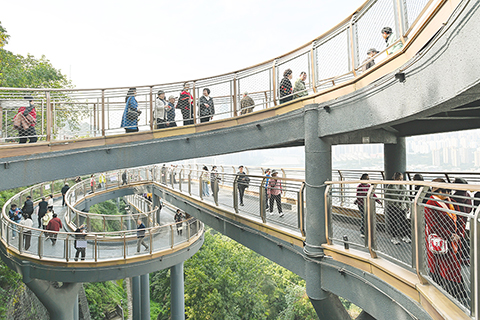 ◎ 十一月二十六日,民眾在重慶半山崖線鵝嶺棧橋觀光遊覽。重慶鵝嶺棧橋位於半山崖線步道鵝嶺段,連接鵝嶺公園和佛圖關公園,全長約四百六十米,最大高度達二十八米。棧橋依山就勢、臨崖而建,蜿蜒穿行于崖壁林間,可俯瞰嘉陵江的壯麗景色,自正式開通以來吸引眾多市民遊客前來「打卡」遊玩。(中新社記者何蓬磊 攝)