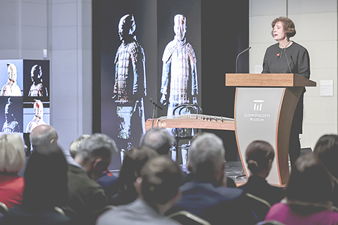 ◎ 「秦漢文明展覽」十一月二十七日在匈牙利布達佩斯美術館開幕。百餘件春秋戰國至秦漢時期代表性文物,包括十件秦始皇陵兵馬俑亮相。圖為當日,在匈牙利布達佩斯,展覽策展人福伊恰克·捷爾吉在開幕式上致辭。(新華社發 鮑洛格.達維德 攝)