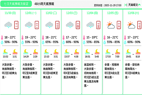 【特訊】地球物理氣象局消息:預測今日大致多雲。有幾陣微雨。吹二至三級東北風。氣溫約為攝氏十八至廿二度。相對濕度介乎百分之五十至九十之間。預測最高紫外線指數約為四,級別屬於中等。◇