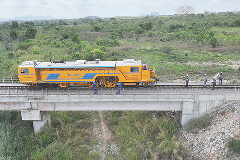 ◎ 十一月二十八日,中鐵二十局搗固車對莫桑比克納卡拉走廊鐵路進行養護(無人機照片)。(新華社記者 劉傑 攝)