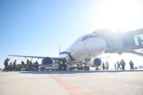 ◎ 十二月一日,東航MU9179航班降落在海拔一千九百四十八點七米的蘭州中川國際機場,標誌著國產大飛機C919開啟上海至蘭州的定期商業航班運營,這是東航首次使用C919執飛高原機場。圖為MU9179航班裝卸行李。(中新社記者 李亞龍 攝)