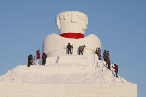 ◎ 十二月五日,黑龍江哈爾濱,第卅八屆太陽島雪博會標誌性景觀「雪人先生」啟動雕刻施工。四十餘名雪雕匠人在二十餘米高的雪坯上緊張作業。據悉,今年的「雪人先生」在延續往年經典形象的基礎上,高度提升至廿三點八米,用雪量達五千立方米。(中新社發 于琨 攝)