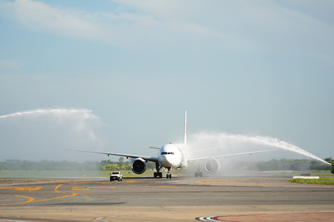 ◎ 中國東方航空公司MU745航班十二月四日抵達阿根廷首都布宜諾斯艾利斯的埃塞薩國際機場,緩緩穿過象徵民航最高禮儀的「水門」。這標誌著中阿兩國之間首條直航航線開通。圖為當日,中國東方航空公司執行MU745航班抵達阿根廷首都布宜諾斯艾利斯埃塞薩國際機場後通過「水門」。(新華社記者 張鐸 攝)