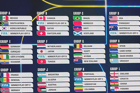 B組:加拿大、卡塔爾、瑞士、歐洲附加賽A(意大利/北愛爾蘭/威爾士/波斯尼亞)C組:巴西、摩洛哥、海地、蘇格蘭D組:美國、巴拉圭、澳洲、歐洲附加賽C(土耳其/羅馬尼亞/斯洛伐克/科索沃)E組:德國、科特迪瓦、厄瓜多爾、庫拉索F組:荷蘭、日本、突尼斯、歐洲附加賽B(烏克蘭/瑞典/波蘭/阿爾巴尼亞)G組:比利時、埃及、伊朗、新西蘭