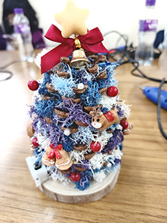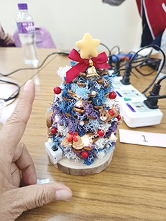 松果子經過修飾後變成一棵小小聖誕樹,樹頂有星星、蝴蝶結、金色風鈴;樹身貼著薑餅人、聖誕鈴、小鹿和紅白互間的小珠粒。再拉上發光的Led小燈開亮,霎時變得可愛美麗。