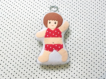 (八)將裁剪好的娃娃,用珠針固定在一塊絨布的布面上,再沿圖案形狀裁剪好;接著在適合位置套入對摺了的棉繩,再以鎖針的方法縫製及塞滿棉花。