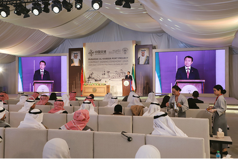 中企簽署科威特大穆巴拉克港項目首個EPC合同 2025-12-24 03:30:00 ◎ 中國交通建設股份有限公司承建的科威特大穆巴拉克港一期EPC項目簽約儀式十二月二十二日在科威特傑赫拉省東北部布比延島舉行。科中官員及企業代表等約二百人出席儀式。圖為當日,在科威特傑赫拉省東北部布比延島,中國駐科威特大使館臨時代辦劉翔在簽約儀式上發言。(新華社記者 尹炣 攝)