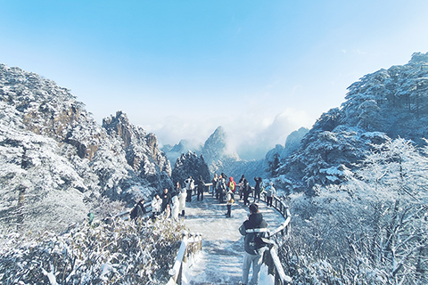 ◎ 十二月二十五日,安徽黃山風景區雪後放晴,山巔之上覆蓋上皚皚白雪,吸引眾多遊客踏雪尋趣。(中新社發 許強 攝)
